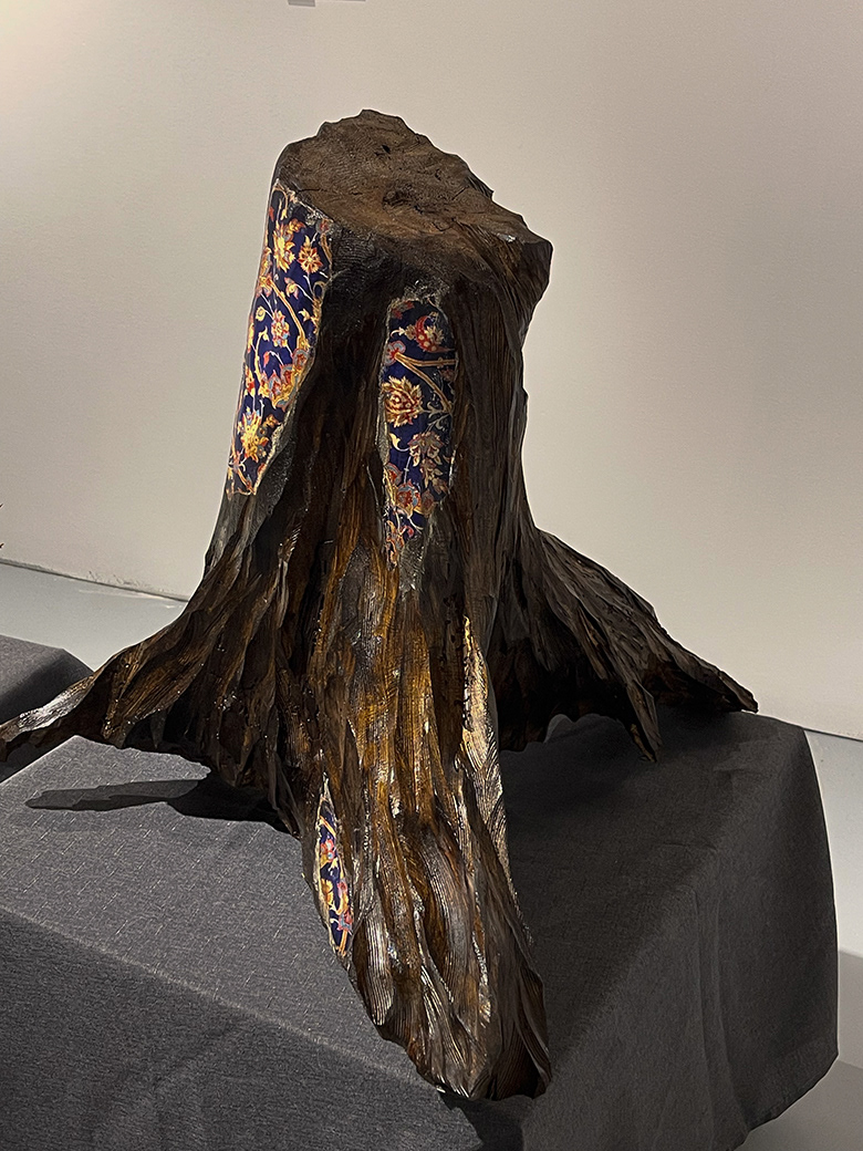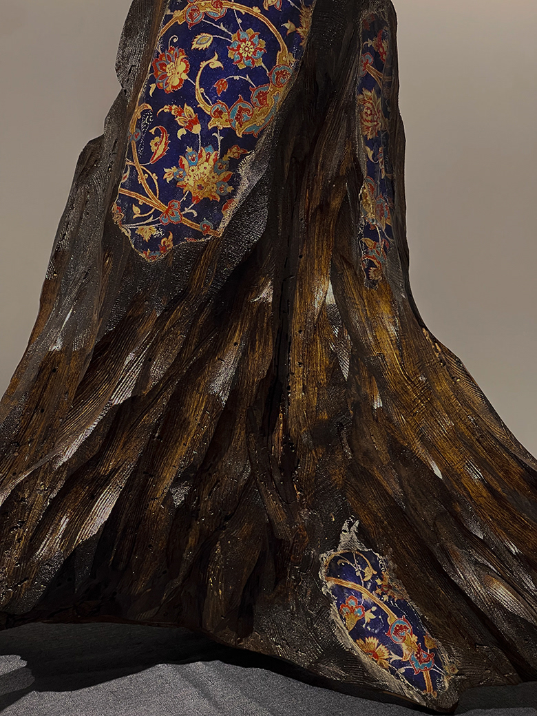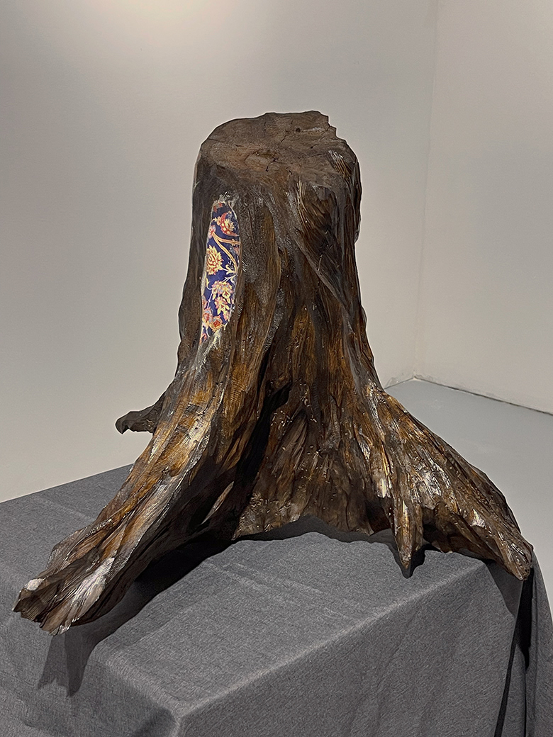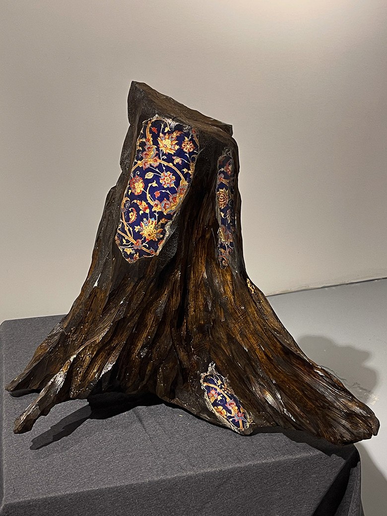 Found tree trunk, hand-carved, stained, Persian carpet transfer, 20x20 in, 2025 Carved from a fallen Banff tree trunk, this sculpture takes on the shape of a windblown dress. A Persian carpet transfer settles into the wood grain, blending the landscape of Alberta with the textures of the artist’s heritage. The bark acts like skin, carrying traces of memory, movement, and strength. The piece reflects the layered nature of belonging and the quiet conversation between two homelands.