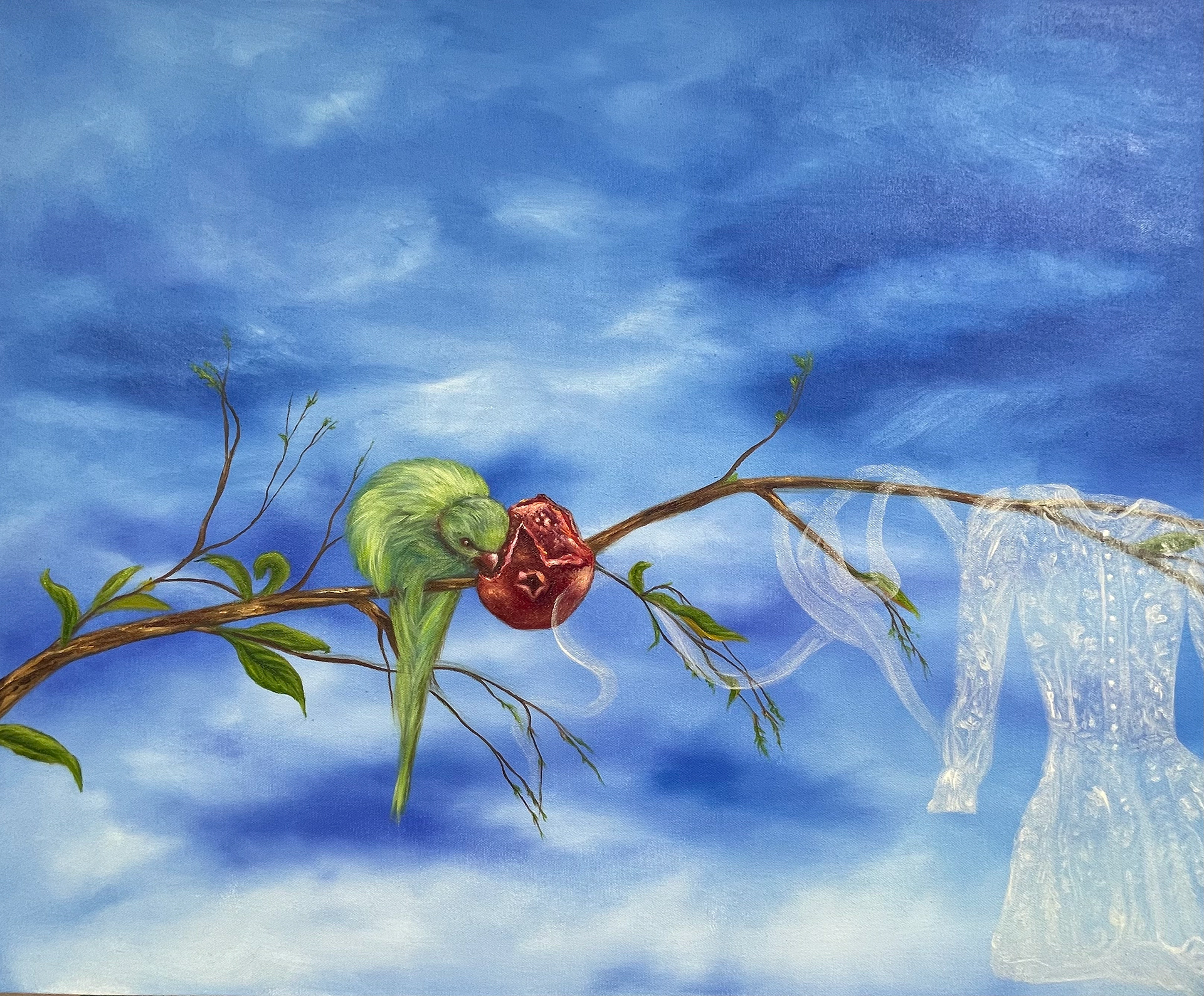 This painting features two mysterious elements on the same branch: a bird with a heart-shaped fruit, guarding something precious, and a lace blouse blowing in the wind, suggesting absence and untold stories. Together, they invite the viewer to imagine whether the secrets are connected or separate, making the branch a quiet keeper of hidden narratives.