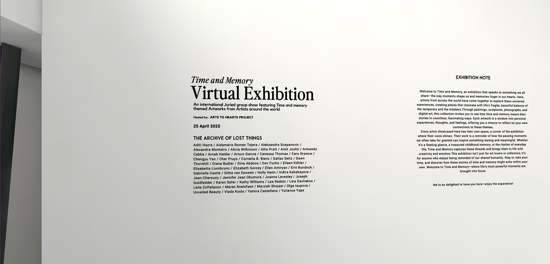 TIME AND MEMORY Juried VIRTUAL EXHIBITION (THE ARCHIVE OF LOST THINGS) 2025-04-25 - 2025-05-25 CURATED BY: ARTS TO HEARTS PROJECT