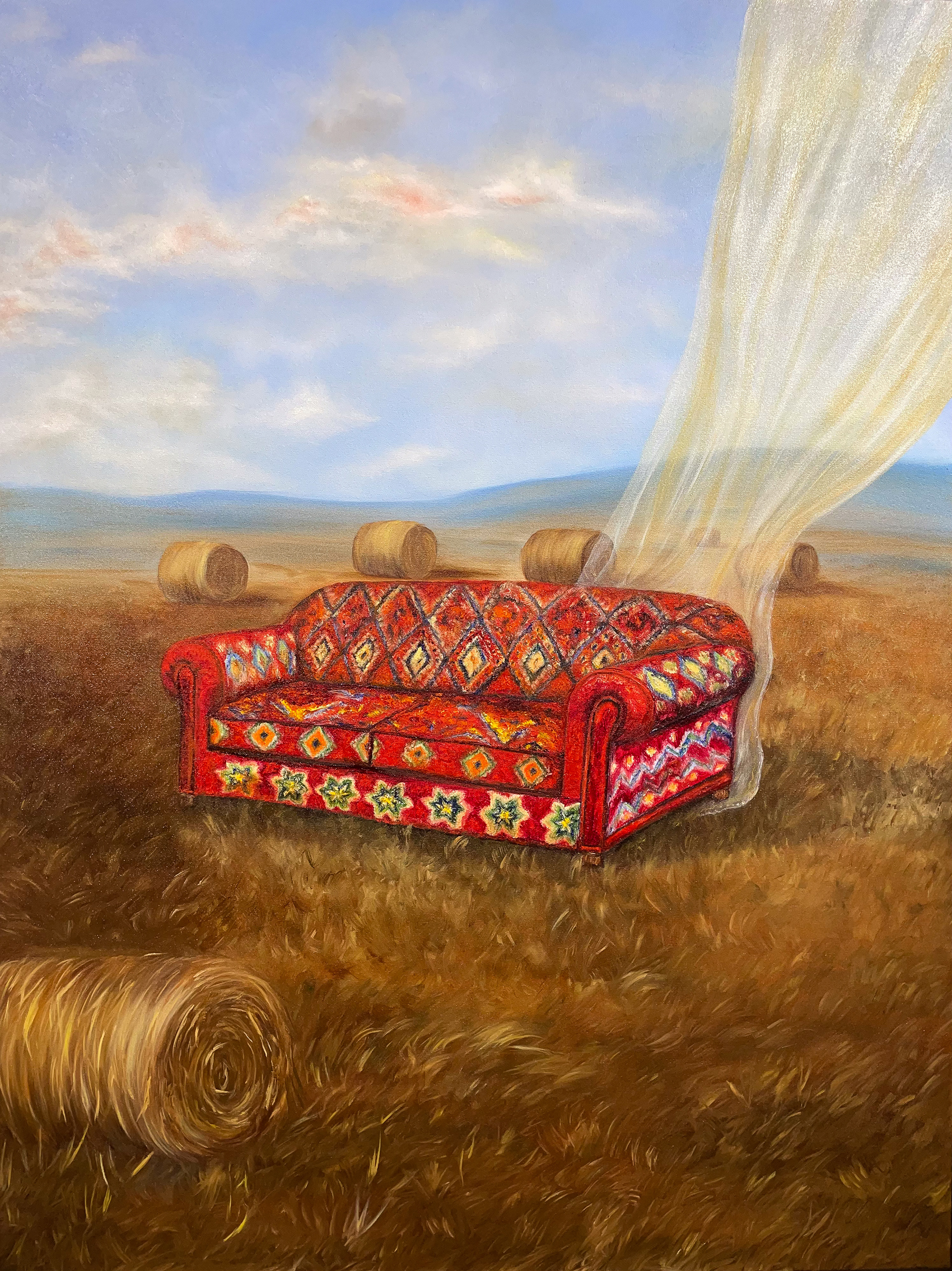 "Under the Golden Air" captures a fleeting moment where nature and stillness breathe together. In a wide, sunlit field, a richly patterned sofa rests among hay bales beneath a sky brushed with soft clouds and warmth. The scene reflects a personal feeling I often experience — a simple wish to pause, relax, and sink into a comfortable couch in the golden fields of Alberta. A sheer fabric drifts through the right corner, caught by an unseen breeze — a whisper of movement beneath the still air. The composition balances grounded textures and ethereal motion: the solid earth and woven threads of the sofa contrast with the shimmer of light and the gentle movement of the wind. It evokes that quiet instant before evening — when everything glows, the world pauses, and the air itself seems golden.