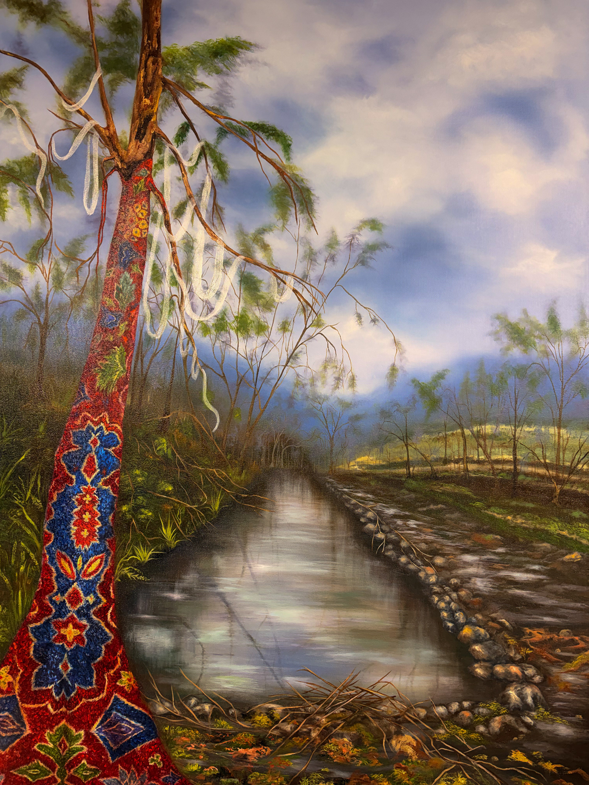 What the Roots Know shows a tree in a familiar landscape, its trunk and roots marked by a Persian carpet pattern that follows the natural grain of the bark. Worn and uneven, the pattern feels absorbed into the tree rather than placed upon it.